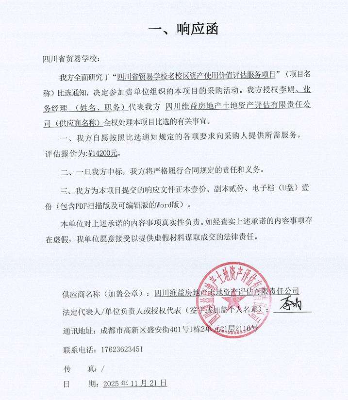 评审小组确认,本次评审活动遵循了公开、公平、公正的原则,严格按照采购文件规定的程序和方法执行。评审过程规范,记录完整。现推荐“四川维益房地产土地资产评估有限责任公司”为成交供应商,成交报价为人民币壹万肆仟贰佰元整(¥14,200.00)。