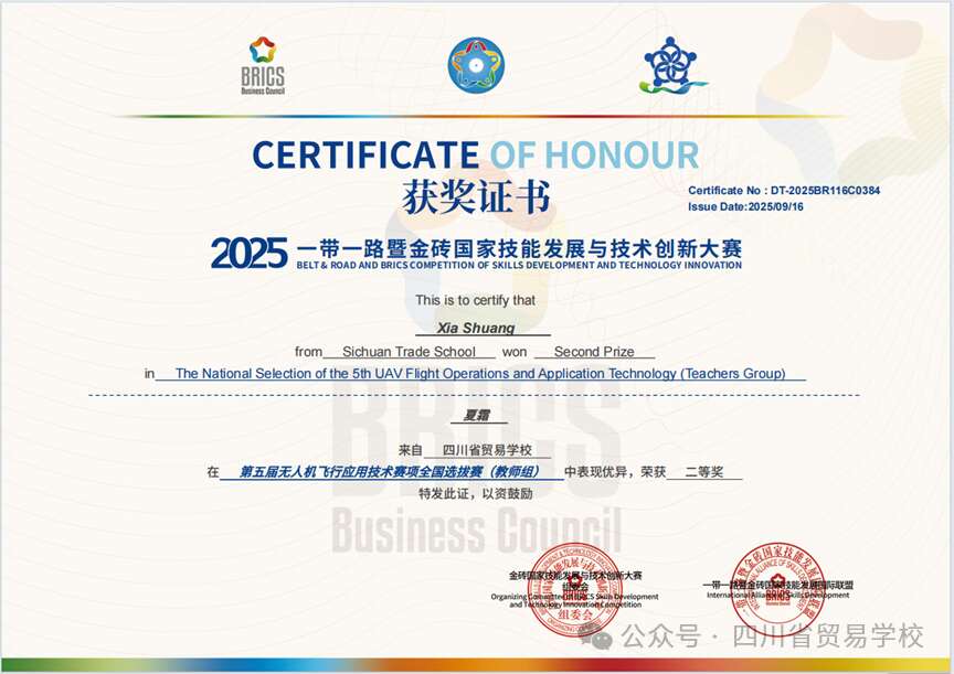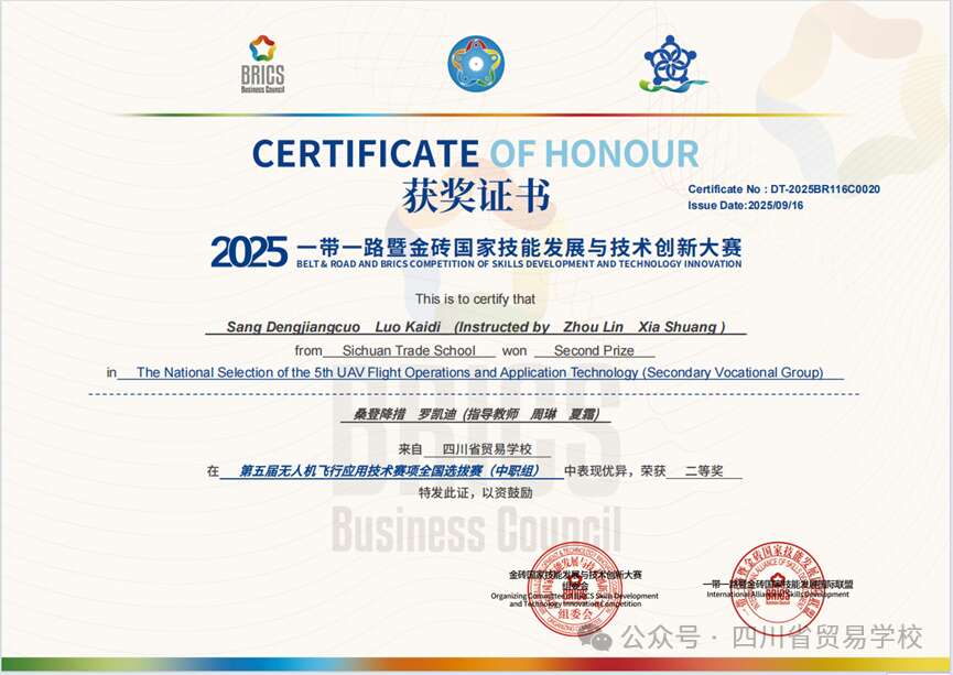 在2025年一带一路暨金砖国家技能发展与技术创新大赛第五届无人机飞行应用技术赛项全国选拔赛中,我校师生再创辉煌。由夏霜老师、罗凯迪同学及桑登降错同学组成的参赛团队,经过多轮激烈角逐,最终分别荣获教师组二等奖和中职组二等奖。